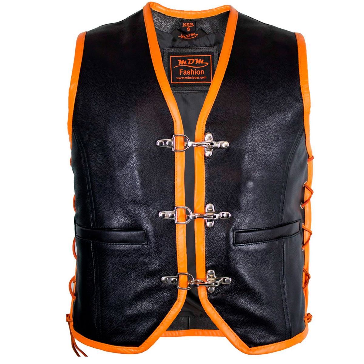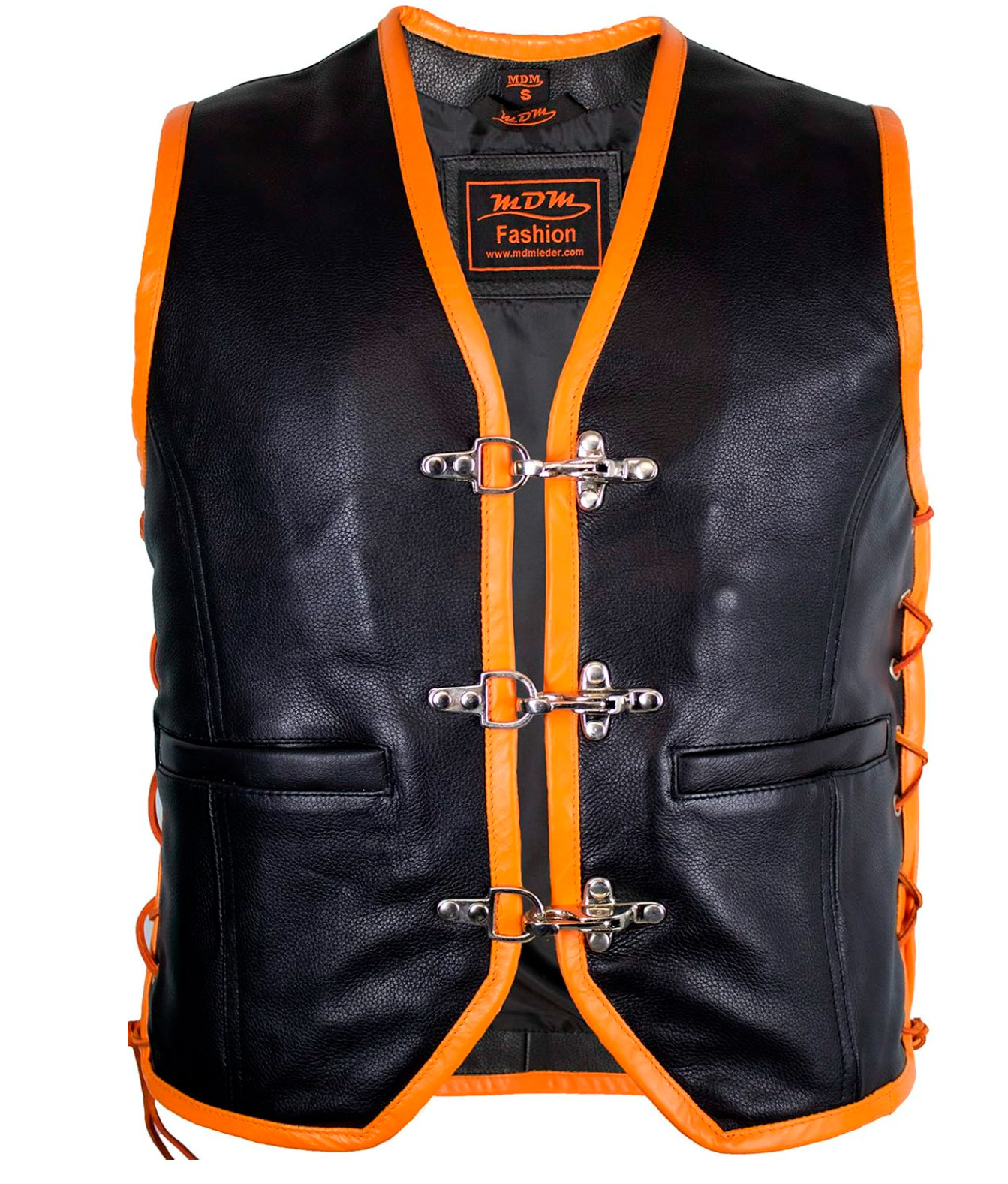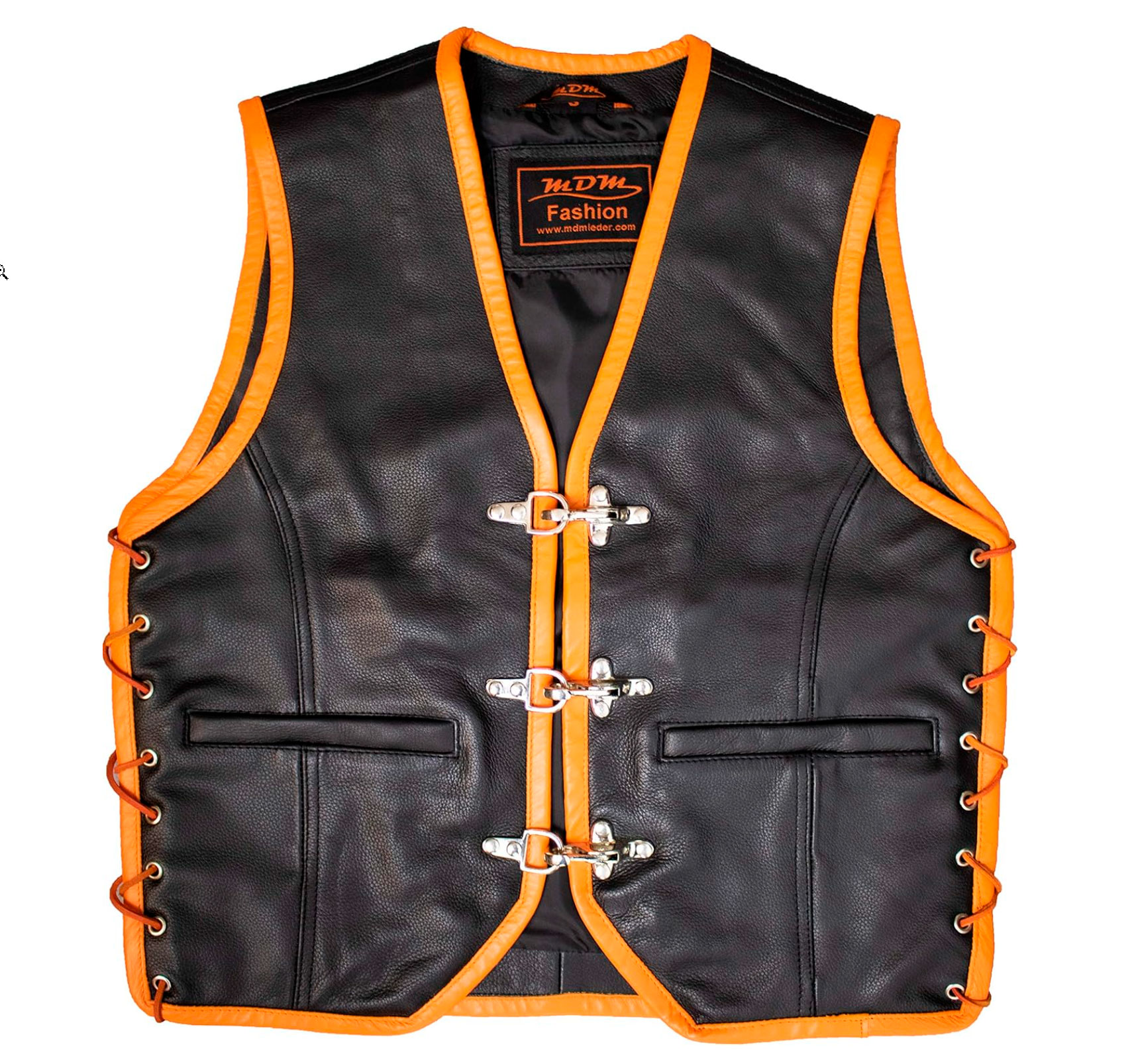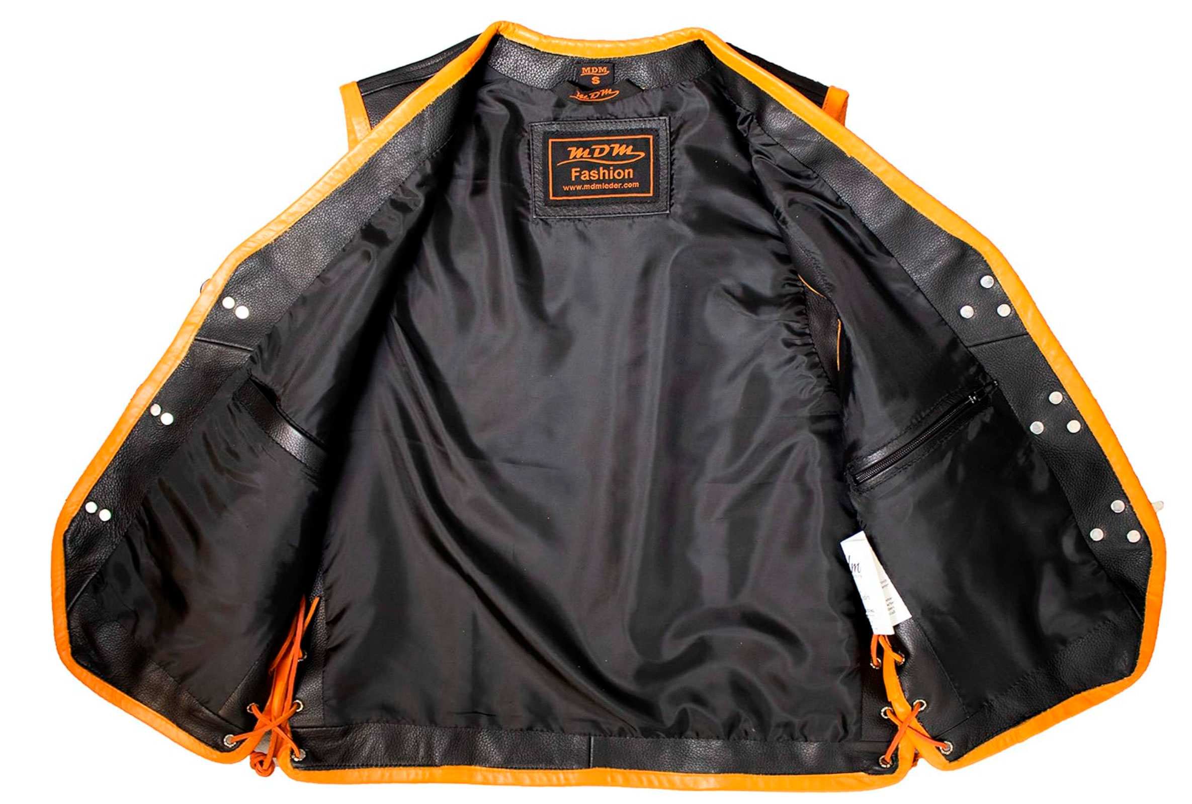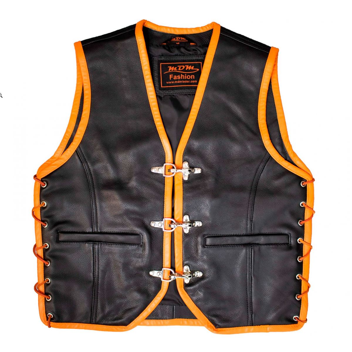 Жилет чорний з помаранчевою шкіряною окантовкою.
