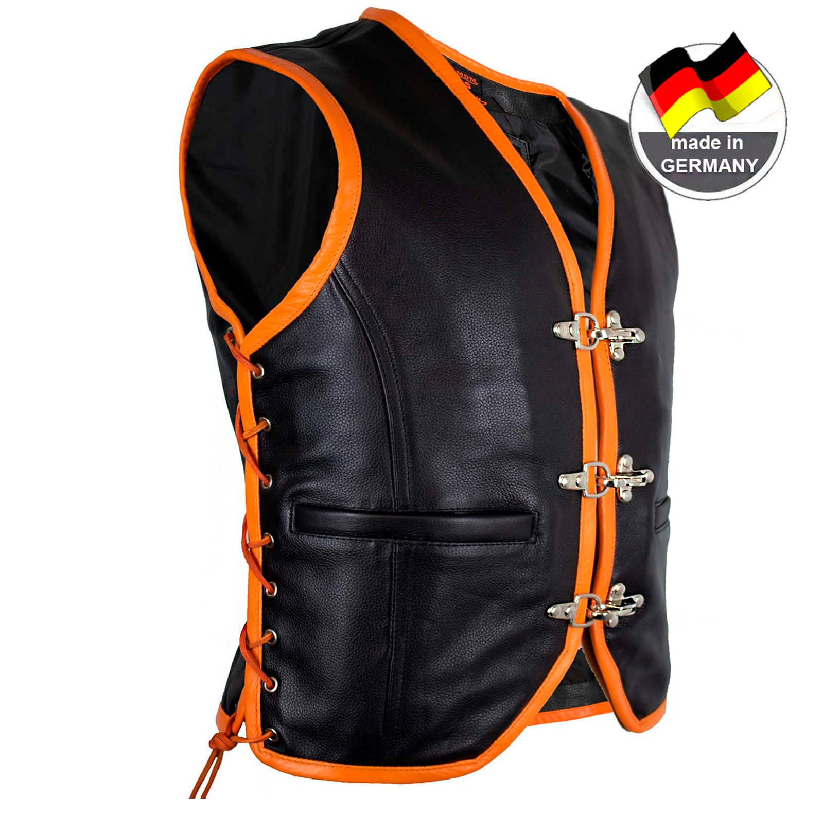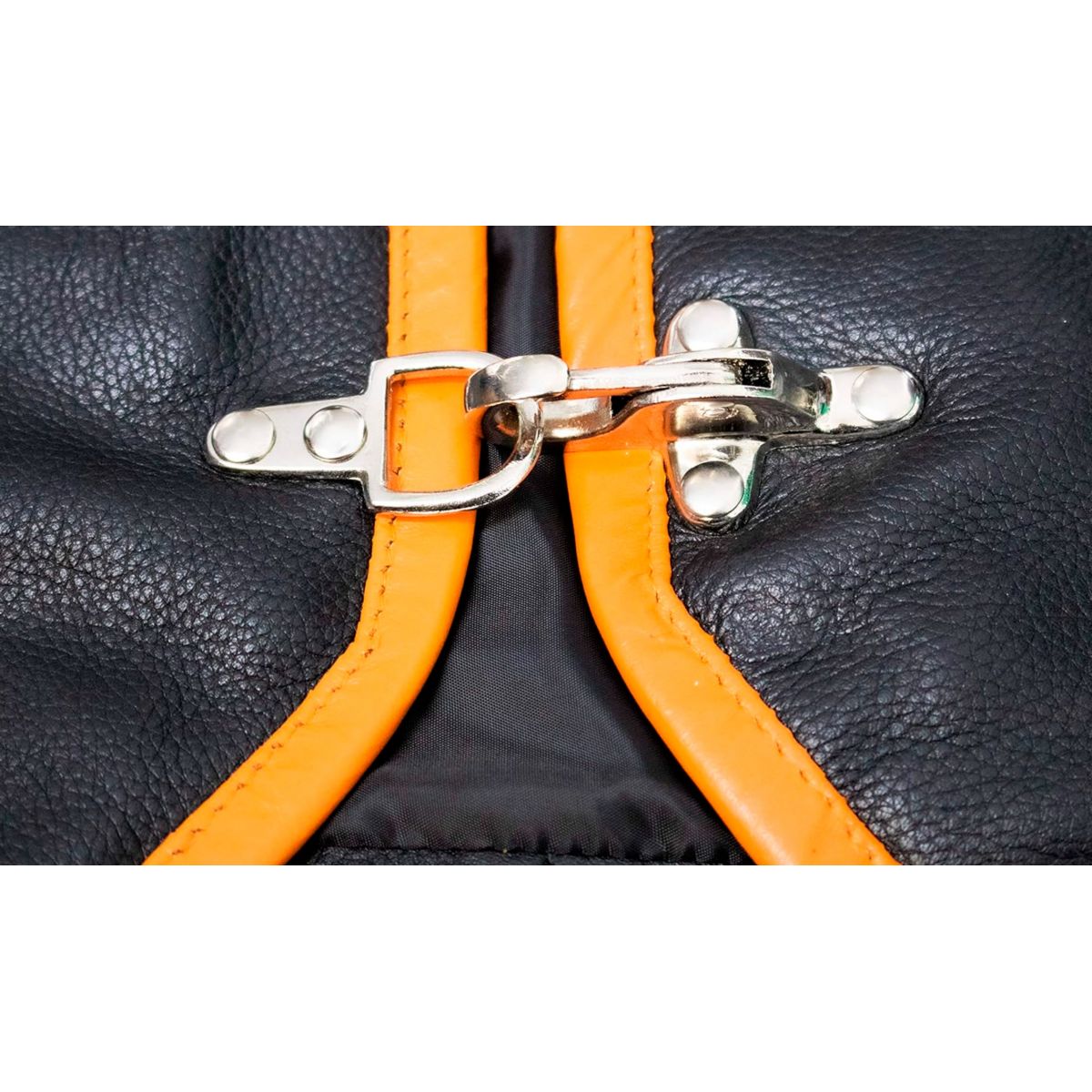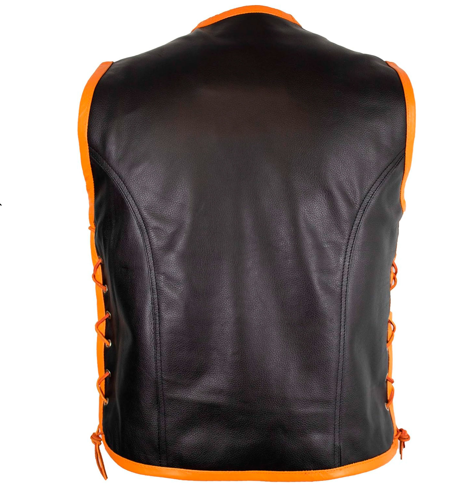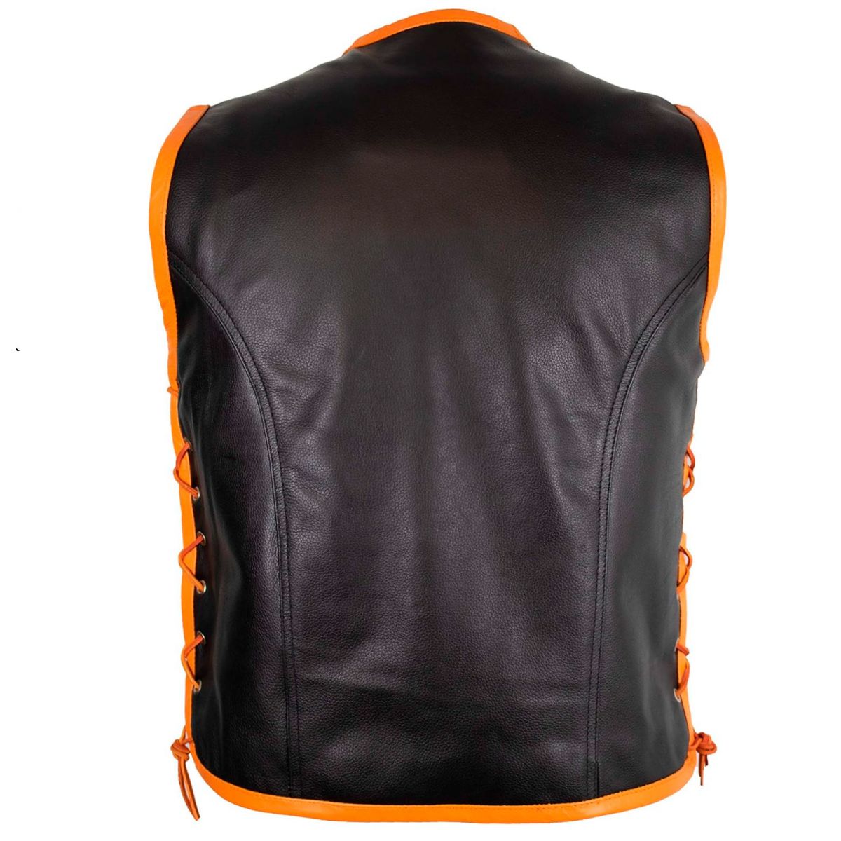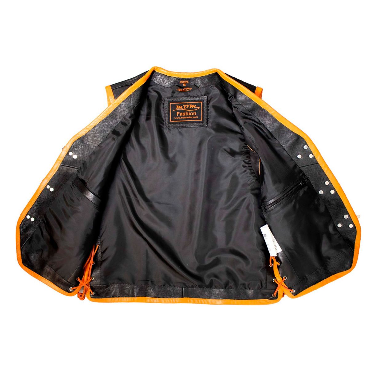 Жилет чорний з помаранчевою шкіряною окантовкою.