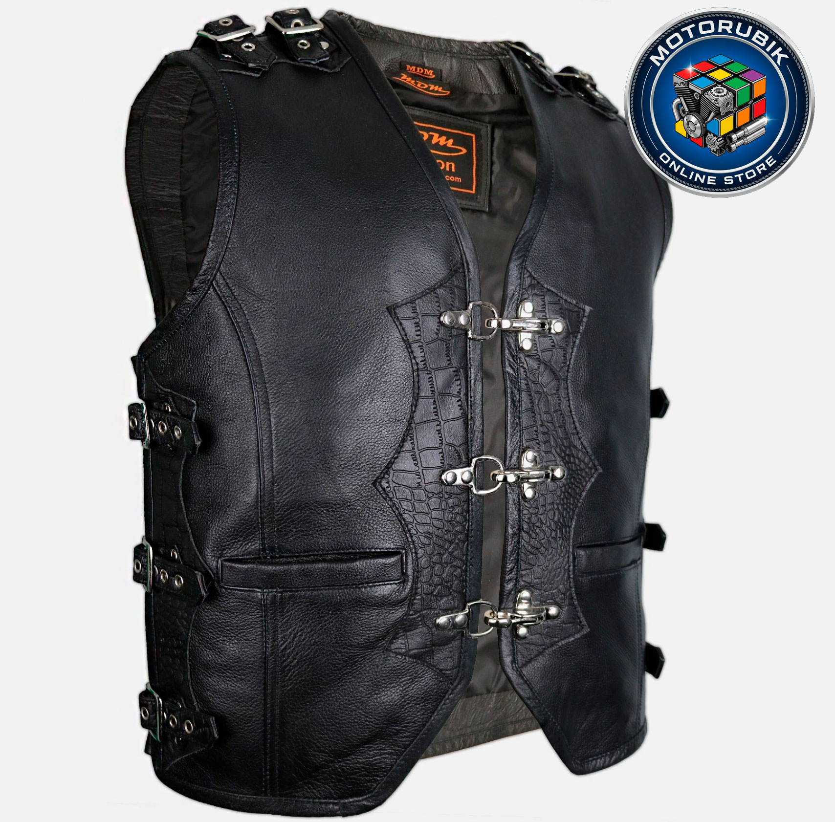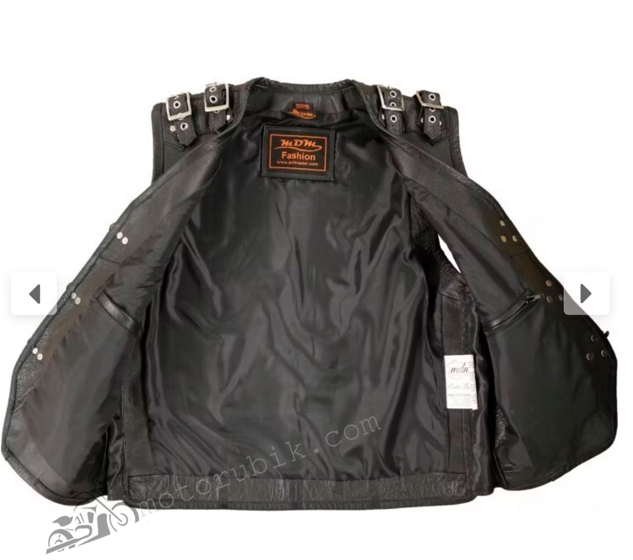- Регульований розмір: Жилет можна розширити до 5 см з обох боків завдяки пряжкам, що дозволяють носити його як самостійно, так і поверх шкіряної куртки.