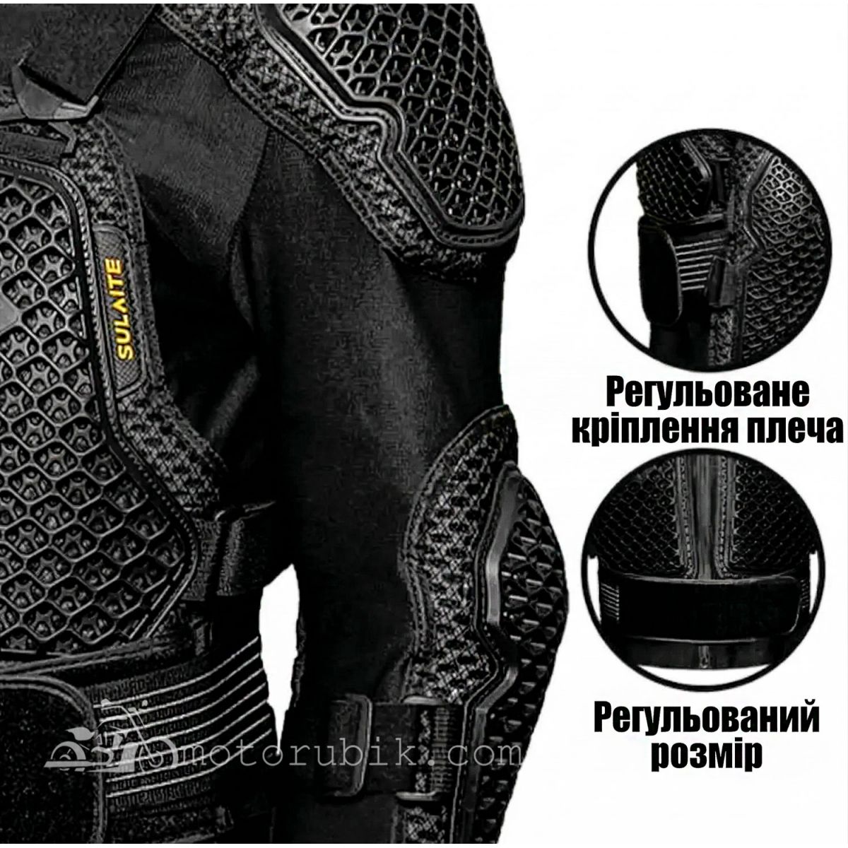 - Зони захисту: Плечі, лікті, груди, спина, поперек.