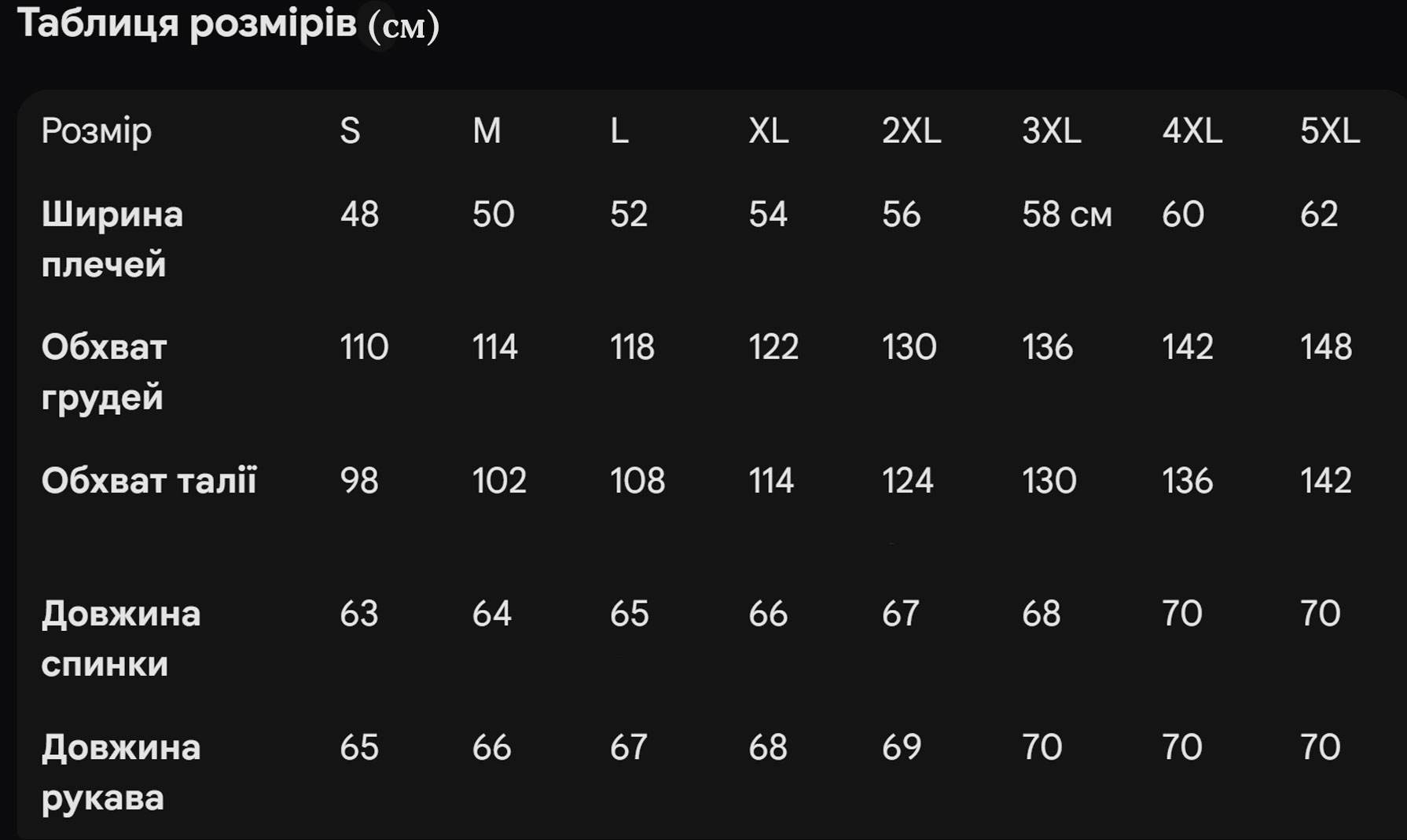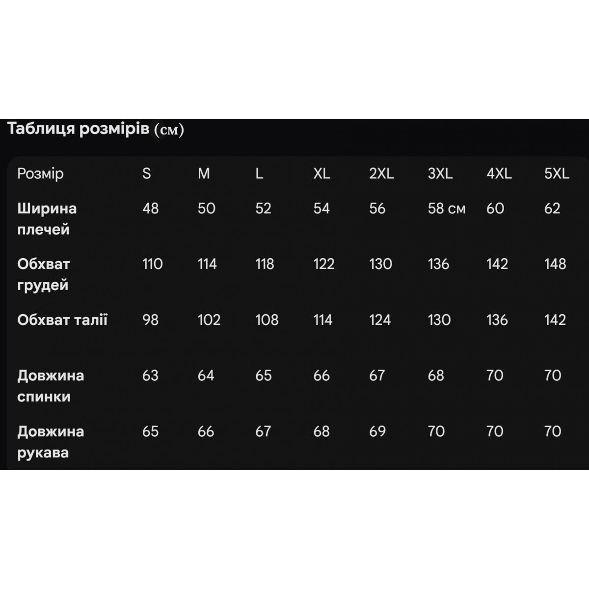 - Доступні розміри: Від S до 5XL (наявність конкретного розміру уточнюйте при замовленні)