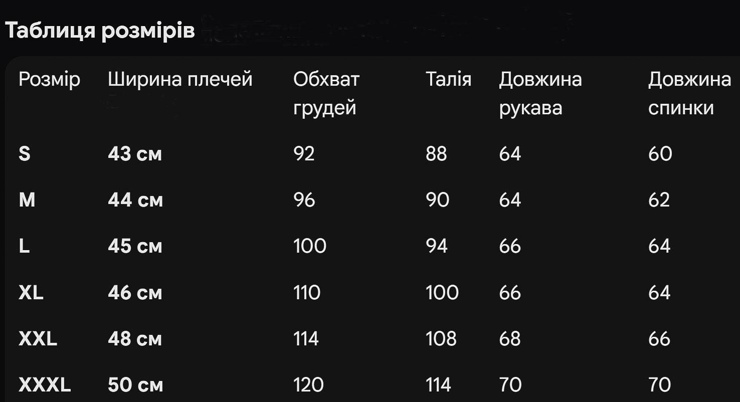 Порада щодо вибору: Будь ласка, обов'язково ознайомтеся з нашою таблицею розмірів перед замовленням, щоб обрана куртка ідеально підійшла вашій фігурі.